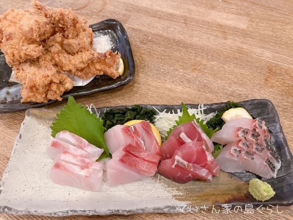 この日のお刺身盛りは、セイイカ、シイラ、アオチビキ。