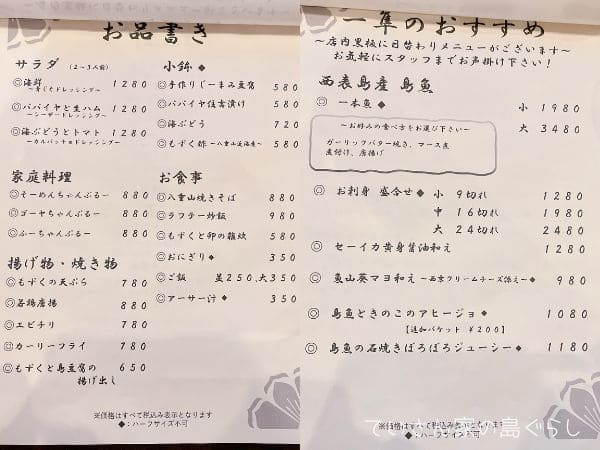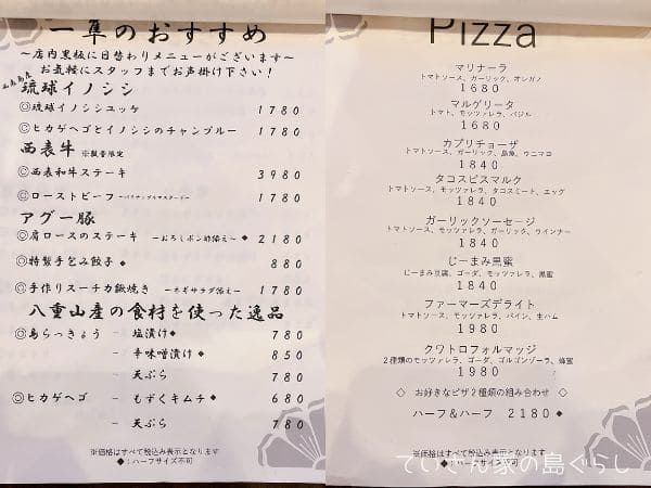 西表島のおしゃれ居酒屋、一隼のお食事メニュー