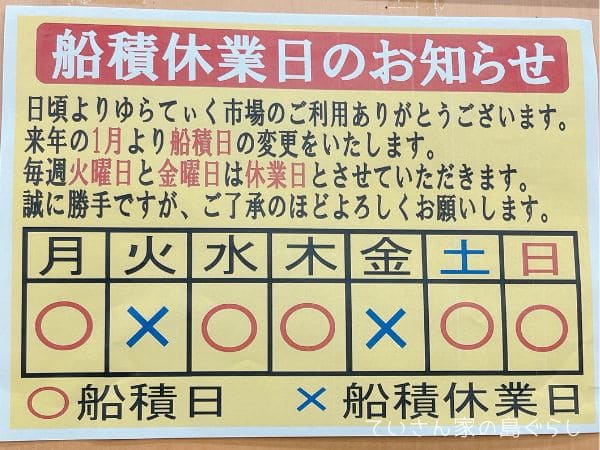 ゆらてぃく市場の船積みは、当日の客船のみとなっています。